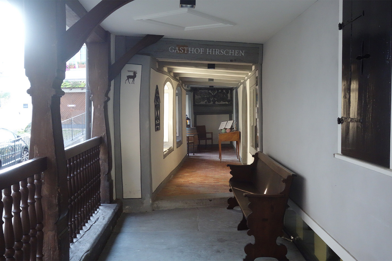 Der Hirschen am südöstlichen Dorfausgang ist der prächtigste Bau des Dorfes. Er ist grösser als anderen, die Tragbalken sind noch fantasievoller gesetzt, und er verfügt über einen Erker, den ein früherer Besitzer einmal angebracht hat. Erbaut im Jahr 1684 war der Hirschen einhundert Jahr lang Sitz der einflussreichen Familie Wehrli mit ihren Vögten, Richtern, Amtmännern, Rittmeistern und Gutsbesitzern. 1789 wurde der Hirschen, jetzt mit einem neuen Besitzer, im Grundbuch erstmals als Gasthaus erwähnt. 150 Jahre später kauften Nachkommen der Wehrli-Familie den Hirschen zurück, und vor 25 Jahren übernahm der Zürcher Unternehmer Fritz Wehrli-Schindler das Ensemble mit seinen sechs historischen Gebäuden. Er liess die fünf Liegenschaften ausbauen und renovieren, und so entstand, in enger Zusammenarbeit mit Behörden und Denkmalpflege, ein Gasthof zwischen Tradition und Moderne. Das Resultat wurde von der internationalen ICOMOS im Jahr 2014 mit der Auszeichnung für das historische Schweizer Hotels geehrt.