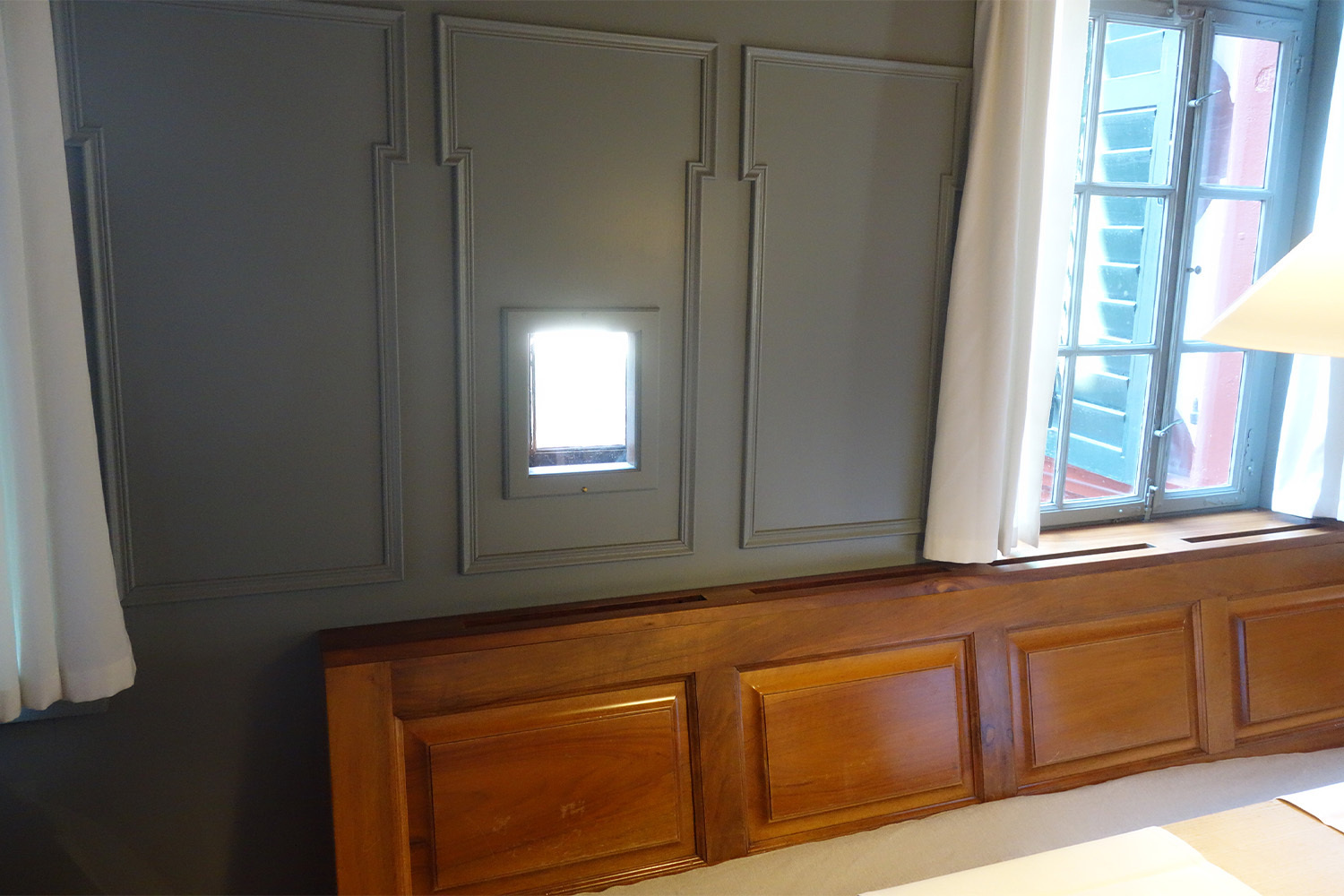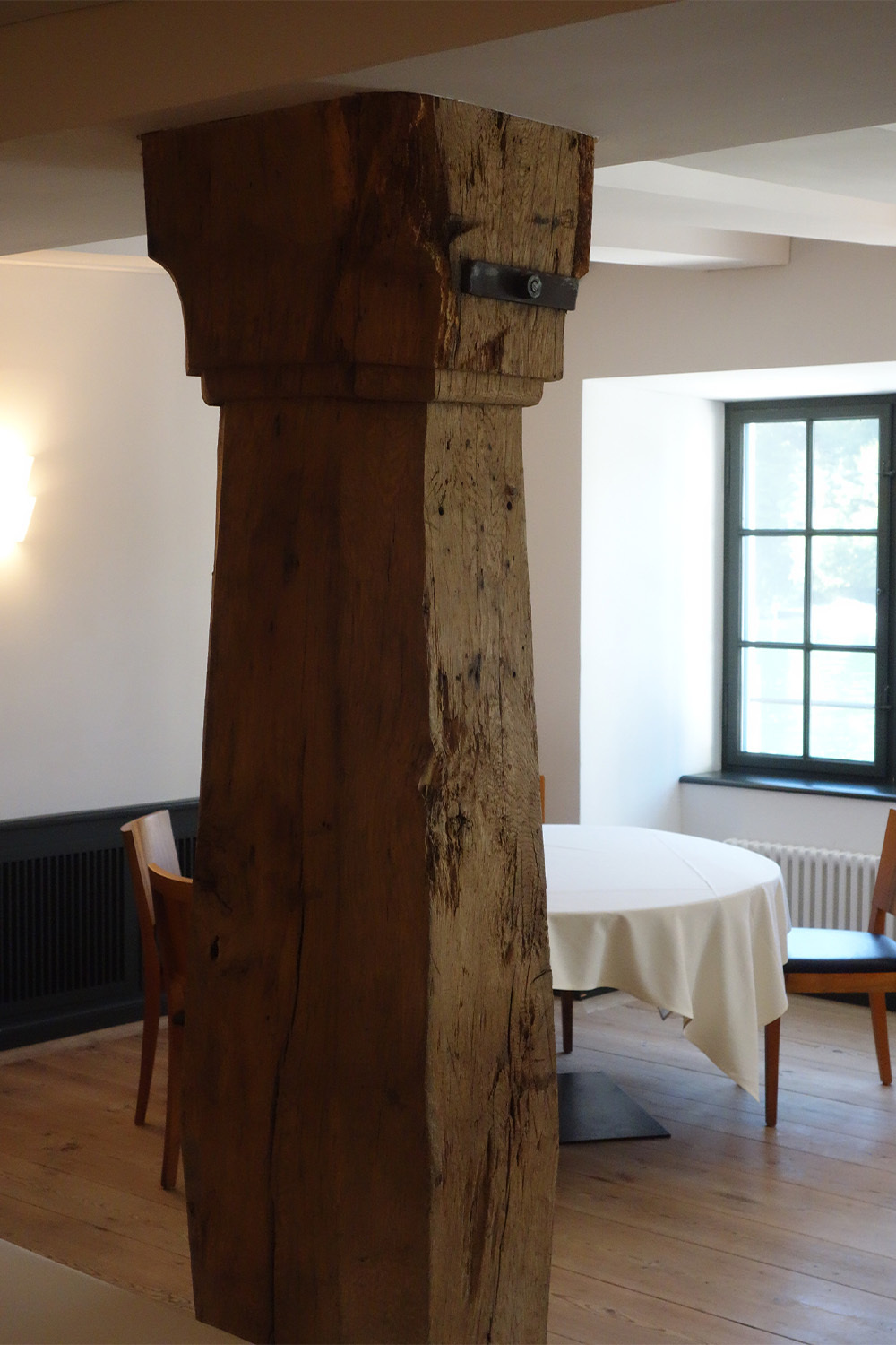 Wer hier übernachtet, hat die Wahl zwischen diesen beiden Polen. Die Zimmer im Hauptgebäude sind noch genau so, wie sie in früheren Zeiten waren, mit altem dunklem Holz und alten Möbeln. Wer leichter und heller wohnen will, wählt eines der Zimmer, die in das sogenannte Haus Wyttenbach eingebaut wurden. Dort wartete im Treppenaufgang eine Überraschung auf mich, die mir ans Herz ging: Bei der Renovation wurde das Flechtwerk aus Weidenzweigen freigelegt, mit dem die Zwischenräume zwischen den Balken armiert wurden. Es ist ein eindrückliches Zeugnis von Handwerkstradition aus dem 17.Jahrhundert.