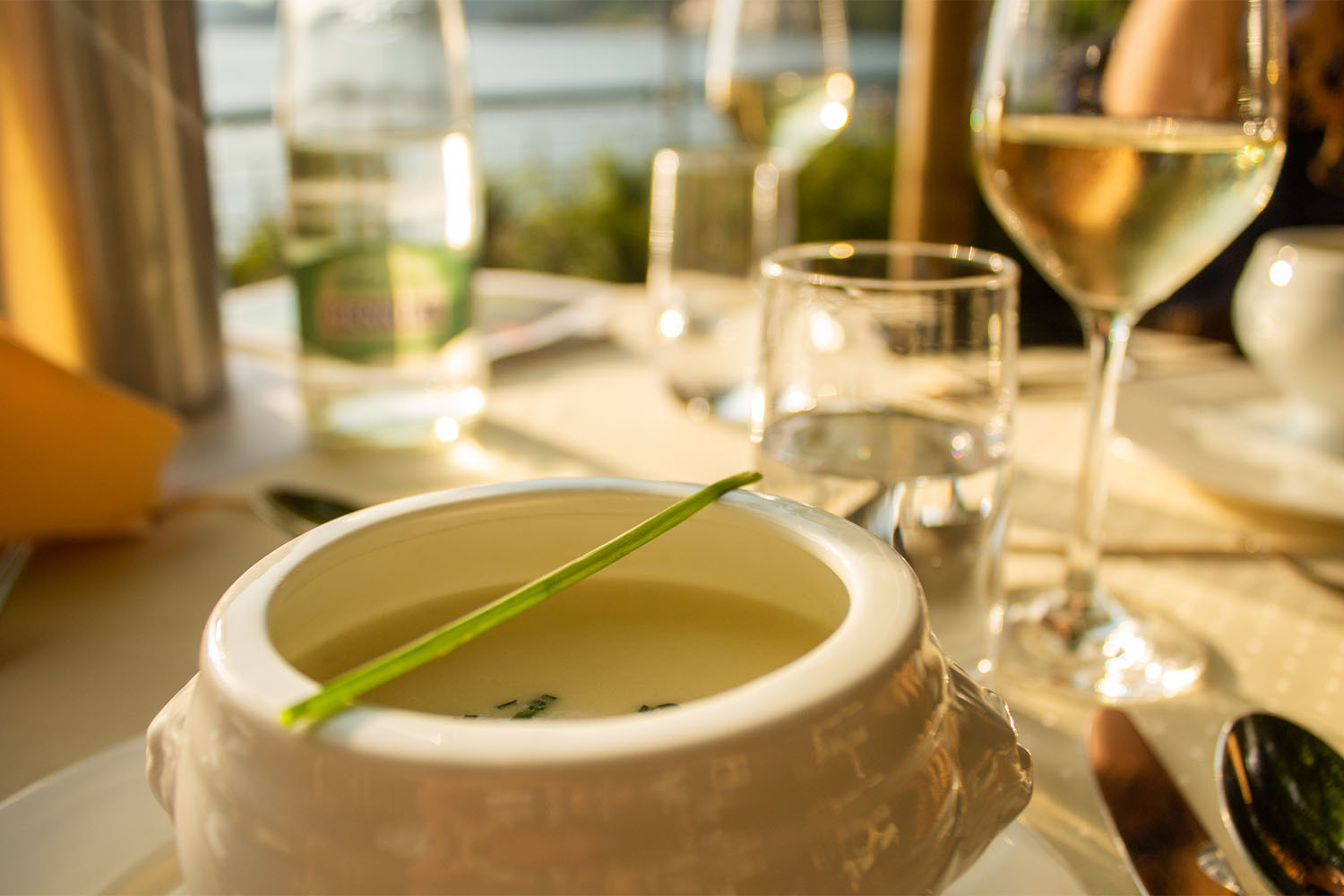 Kurz darauf kommt unsere Gastgeberin die Treppe herauf und lädt zum Mittag im Garten unter den Kastanien. Hier stärken wir uns mit Blick auf den See für einen Nachmittag auf dem Wasser. Und hier lassen wir auch am Abend diesen ersten Tag ausklingen. Die Sonne verschwindet langsam hinter dem Berg am Ende des Sees, während uns der Hausherr die Geschichte des Weines näher bringt und die Gastgeberin uns empfiehlt, auch nach dem Sonnenuntergang sitzen zu bleiben. Denn die "Blaue Stunde" sei nach einem ohnehin schon schönen, leuchtenden Sonnenuntergang die Krönung eines jeden Tages. Wir bleiben und betrachten auch das orangene Spektakel vor dem Abschied des gelben Balls am Himmel. Und wir bleiben auch für ein Gespräch mit der Gastgeberin Pia Scherrer. Dazu wärmt uns ein Kräutertee, in der gerade anbrechenden kühlen Sommernacht. Pia Scherrer berichtet von der Geschichte des Hauses. Der Speisesaal war früher das erste Dansier der Region. Die Steine vor dem Haus wurden nach dem Neubau der Strasse wieder eingesetzt, auch wenn die Bauarbeiter nicht verstanden warum. Aber die Geschichte will erhalten bleiben. Und so knackt und knarzt der Fussboden und erzählt damit auf dem Weg Richtung Balkontür und Frühstücksaal mit jedem Schritt Geschichte. Für den Garten bereiten sie gerade vor, nach und zwischen dem Feierabend in freien Minuten Stühle auf. Bis dahin sorgen die alten Stühle mit ihrem auffälligen Rot für gute Laune unter den Kastanien. Während sie erzählt schaue ich gelegentlich an ihr vorbei durch die zwei Fenster des Speisesaals auf den See und die blaue Stunde. Sie hat Recht, das klassische Orange des Sonnenuntergangs ist strahlend schön, aber die blaue Stunde hat ihren ganz eigenen Reiz.